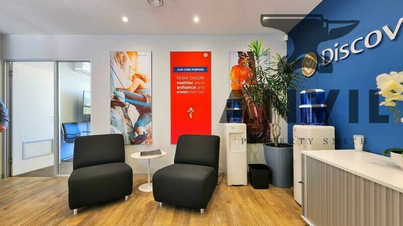 We like the way this one’s laid out. You walk into a central reception foyer, which splits the floor into two workable wings. Training room with seating for 20, natural light and aircon. Nearby are two private consulting rooms, and a run of smaller open-plan and cellular offices.
